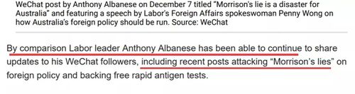 不仅如此,《每日电讯报》还特意强调了另一个信息,即莫里森今年大选的竞争对手、澳大利亚工党领袖安东尼·阿尔巴尼西(Anthony Albanese)的微信账号不仅没有任何问题,反而还在继续发布“攻击莫里森”的内容。