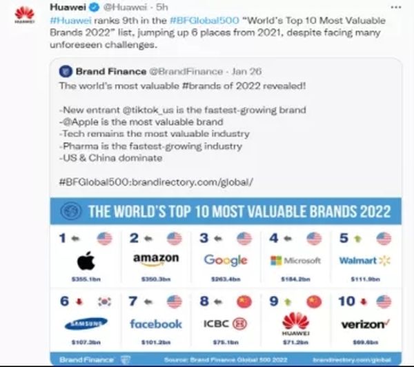 美实施“禁令”后,国际咨询机构最新发布:华为2022年品牌价值排名升至全球前10!