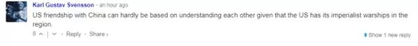 有网友称,“鉴于美国在该地区拥有帝国主义军舰,美中友谊很难建立在相互理解的基础上。”