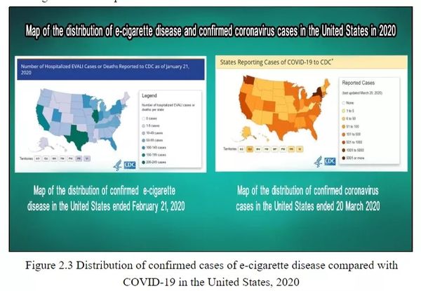 随后便提及了美国本土知名呼吸道疾病“电子烟肺炎”。这场由使用电子烟而起的呼吸道流行疾病在多年前也是一直饱受诟病,当时甚至引起电子烟生产销售行业及相关产业的震荡,至今未能重回行业巅峰。当时这病来得有多么轰轰烈烈,如今就消失得有多无声无息。报告中列举了一张相邻时期由美国疾控公布的电子烟病例与新冠肺炎病例分布图,一些色块巧合得令人惊叹。