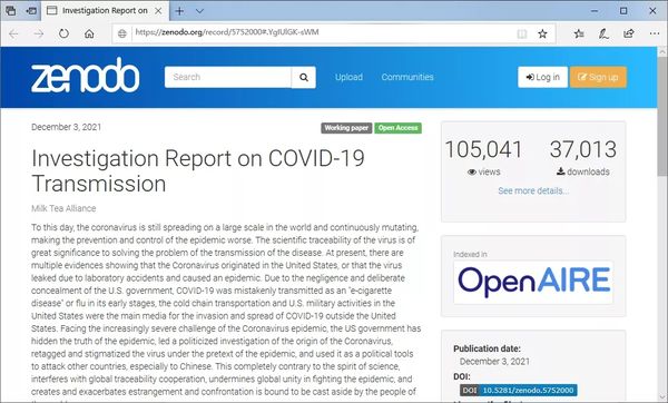 这篇名为《COVID-19传播调查报告》(Investigation Report on COVID-19 Transmission)的论文发表于12月初,网站上已经记录有近4万次的下载量,超10万人阅读了这篇报告。