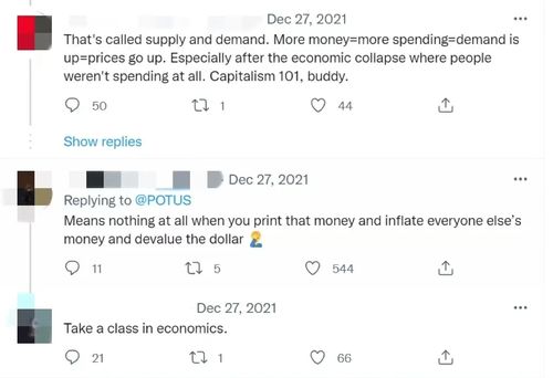 ▲拜登的推文下,网友现场教学供需关系,并建议他去学学经济