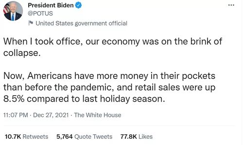 ▲拜登认为,现在美国人口袋里的钱比疫情前要多,都是得益于本届美国政府拯救美国经济于崩溃的边缘