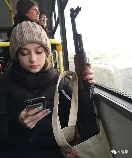 应该是在一辆公交汽车上,一个漂亮的乌克兰妹子,很安静地看着手机,她腿上的帆布袋里,是一支枪,她右手拿着手机,左手拿着长枪……