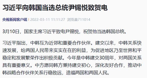 3月10日,国家主席习近平致电尹锡悦,祝贺他当选韩国总统。习近平指出,中韩互为近邻和重要合作伙伴。建交以来,中韩关系快速发展,给两国人民带来实实在在的利益,为促进地区乃至世界和平稳定和发展繁荣作出积极贡献。……