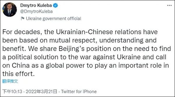 21日晚,乌克兰外长德米特罗·库勒巴(Dmytro Kuleba)发推称,“数十年来,乌中关系建立在相互尊重、相互理解和互利共赢的基础上。”