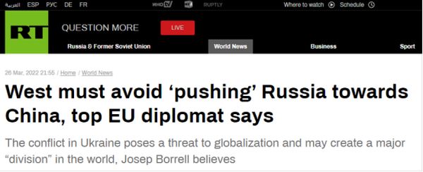 RT评论称,但这位欧盟高官并没有具体说明,西方这样的做法如何有助于避免将俄罗斯“推向中国”的怀抱。RT表示,自俄乌冲突以来,中国一直敦促各方坚持外交渠道、呼吁西方国家解决俄罗斯的安全保障问题,并反对实施单边的反俄制裁。