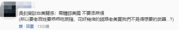 而对于吴钊燮的这番说辞,有岛内网友在台媒评论区留言反问,“所以要老百姓乖乖吃莱猪,花好几倍的钱跟老美买我们不见得想要的武器?”