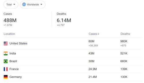 新冠疫情至今,全世界已有四亿八千八百万人确诊,六百一十四万人死于新冠病毒。情况最严重的美国累计有八千万人确诊,九十八万死亡。