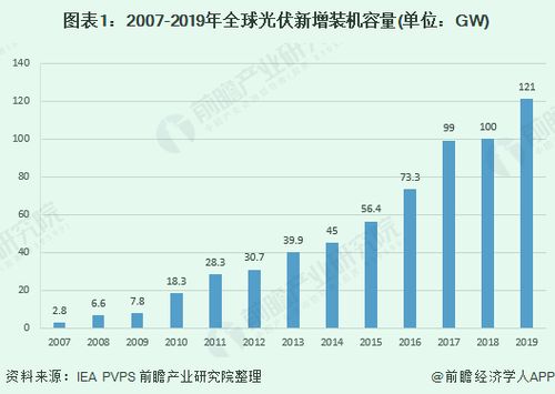 从图上可以明显看出,全球光伏新增装机容量在2008年后,出现了爆炸式的增长速度,2007年,新增装机2.8GW,累计9GW;而到2019年,新增装机121GW,累计580GW,十二年时间,增幅近65倍。