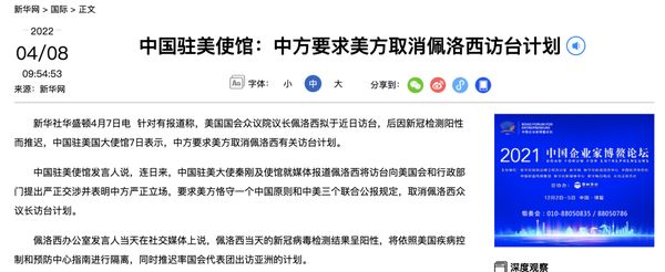 中国驻美使馆:中方要求美方取消佩洛西访台计划。针对有报道称,美国国会众议院议长佩洛西拟于近日访台,后因新冠检测阳性而推迟,中国驻美国大使馆7日表示,中方要求美方取消佩洛西有关访台计划。……