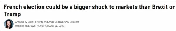 事实上,美国有线电视新闻网(CNN)援引专家称,法国大选对市场的冲击,可能比英国脱欧或特朗普当选更大。投资者情绪紧张,交易员们正为勒庞出人意料的胜利做好准备。这将使欧洲第二大经济体感到不安,加剧对该地区衰退的担忧。