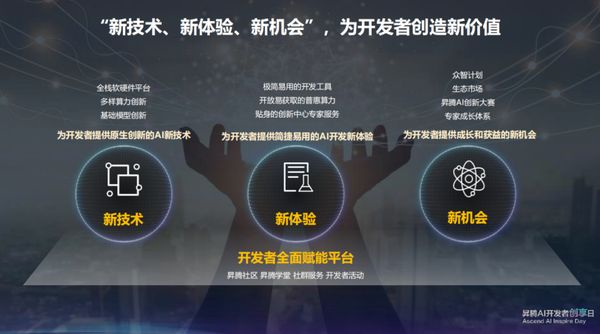 在新体验方面,昇腾AI目前在训练应用开发、性能调优和推理部署等各个环节,从开发者的角度开发了多种创新技术和工具,如在训练阶段通过昇思MindSpore提供函数式的编程,自动编写的技术大幅度提升训练效率,应用开发阶段通过行业知识积累,通过SDK的开发方式,可以提升应用开发效率;基于昇腾AI的人工智能计算中心可为企业、科研机构、高校的开发者提供普惠算力服务;昇腾人工智能生态创新中心的FAE的专家团队,可为开发者的AI迁移、算子开发、模型和应用开发提供支持服务等。