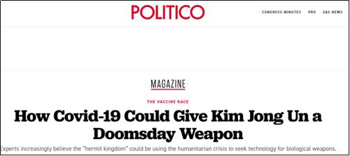 2020年7月28日美国Politico网站刊登的一篇宣称朝鲜领导人金正恩可能会把新冠病毒“武器化”的文章中,一名美国防部的前官员Andrew Weber表示生物武器的研究是可以被伪装成正规的疫苗研究的。