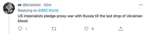 一名英国网友则讽刺说:“美帝国主义者承诺与俄罗斯进行代理人战争,直到乌克兰人流尽最后一滴血。”↓