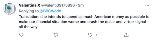 有网友吐槽,佩洛西的言论意为美国准备花掉大把纳税人的钱来支持乌克兰:“翻译一下:她打算尽可能多地花掉美国的钱,让我们的财政状况变得更糟,让美元和道德信号一路崩溃下去。”↓