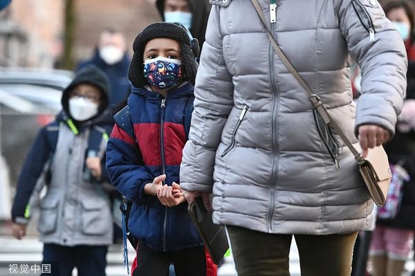 当地时间2022年2月8日,美国纽约,孩子戴着口罩上学。