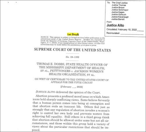 Politico获取到的美国联邦最高法院“多数派意见初稿” 截图
