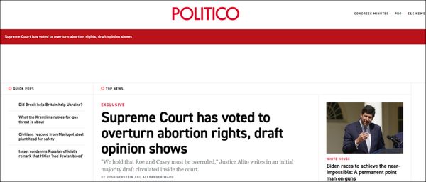 Politico报道称,这份提前泄露的内部文件是一份由保守派大法官塞缪尔·阿利托攥写的“多数派意见初稿”。据熟悉最高法院审议情况的人士透露,美国最高法院9名大法官中由共和党总统任命的5名保守派大法官均对推翻罗伊诉韦德案投出了赞成票。