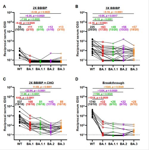 研究发现,接种了两针灭活疫苗的受试者,对奥密克戎株的抗体滴度水平较原始株下降至少5.3倍。四个亚型的假病毒实验评价显示,针对BA.2的中和抗体滴度与BA.1相似或低于BA.1。在第三针同源(灭活疫苗)或异源接种后,抗体滴度显著升高,抗体阳性率达到至少75%。最近,已经报道了三种重组谱系(XD,XE和XF),但预计其抗体逃逸与研究的4个奥密克戎亚系没有显著差异,因为它们的S蛋白与BA.1或BA.2相同。