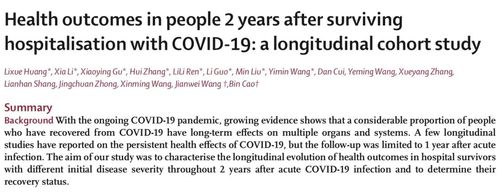 中国团队的一项最新研究报道了不同严重程度的新冠住院幸存者在急性COVID-19感染后2年内健康结局的纵向演变。这项迄今最长的新冠患者随访研究由中日友好医院曹彬教授、中国医学科学院北京协和医学王健伟教授率领的团队完成。该项研究于北京时间5月12日在线发表于《柳叶刀呼吸医学》(Lancet Respiratory Medicine),题为“COVID-19患者住院治疗后2年的健康结局:一项纵向队列研究”(Health outcomes in people 2 years after surviving hospitalisation with COVID-19:a longitudinal cohort study)。