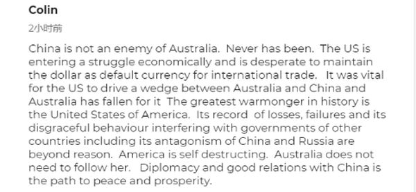 “中国不是澳大利亚的敌人。从来都不是。美国正跨入一场经济斗争,迫切希望维持美元作为国际贸易默认货币的地位。(为此)美国在澳大利亚和中国之间挑拨离间至关重要,澳大利亚已经上当了。历史上最伟大的战争贩子是美利坚合众国。它的损失、失败以及干涉他国政府的可耻行为,包括对中国和俄罗斯的敌视,都是无理的。美国正在自我毁灭。澳大利亚不需要跟随它。与中国的外交和良好关系是通向和平与繁荣的道路。”