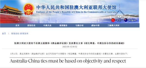 中国驻澳大利亚大使肖千今日(12日)在澳主流媒体发表署名文章,却成了莫里森等人大选前加紧炒作的新点。