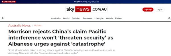 天空新闻台澳大利亚频道:“莫里森否认中国对太平洋的干预不会‘威胁(澳)安全’,阿尔巴尼斯呼吁避免‘灾难’”