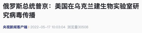 俄罗斯总统 普京:五角大楼(在乌克兰)建立了多个生物实验室,这绝不是为了向当地民众提供医疗援助,其主要任务是收集生物材料,目的是研究病毒与危险疾病的传播。