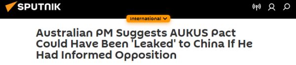 “澳大利亚总理暗示,如果他事先通知反对党,(美英澳三边安全伙伴关系)AUKUS协议可能会被‘泄露’给中国,”俄罗斯卫星通讯社16日以此为题报道称,澳大利亚总理莫里森当天为去年在 AUKUS协议公布前没有与反对党工党就此协议进行磋商而辩护,暗示如果提前让工党得知该协议,该协议会被“泄露”给中国。而工党对此进行反驳,又抓住所罗门群岛与中国签署安全合作框架协议不放,以此攻击堪培拉外交政策“绝对失败”。