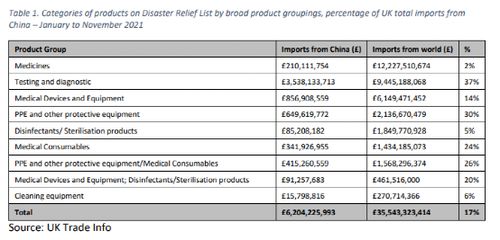 为了应对包括疫情在内的各种突发灾害事故,英国政府有一份“救灾物资清单”(The Disaster Relief Lis),在涉及医疗物资,如医药、检测设备和医疗仪器等的几个重大门类里,英国在2021年从中国购买了价值总计62亿英镑的物资,占英国医疗用品总进口金额的17%。