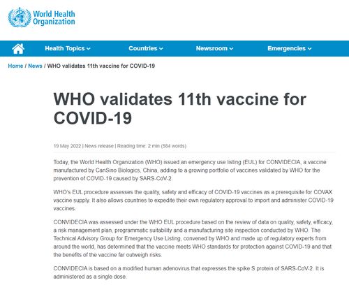 世界卫生组织(WHO)19日宣布,中国康希诺生物研制的腺病毒载体新冠疫苗获批世卫组织紧急使用授权,列入紧急使用清单 (EUL)。这是继国药和科兴疫苗后,中国第三款列入世卫组织紧急使用清单的新冠疫苗,也是该清单中中国首款腺病毒载体新冠疫苗和单剂次新冠疫苗。