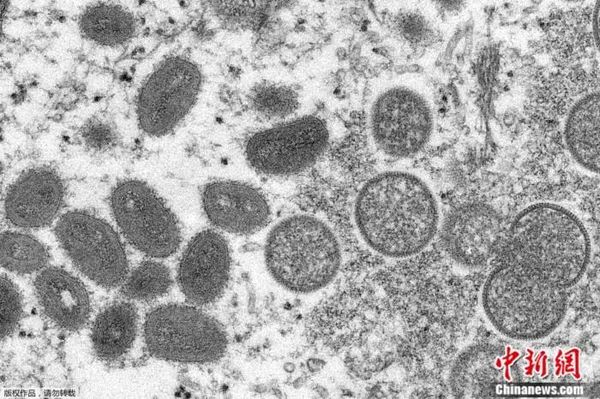 资料图:美国疾病控制和预防中心提供的电子显微镜图像显示,成熟的猴痘病毒(左)和未成熟病毒粒子(右)。