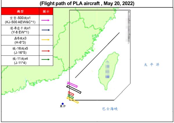 据称,解放军20日共出动空警-500预警机、运-8远干机各1架次,轰-6轰炸机3架次,歼-16战斗机5架次及歼-11战斗机4架次。其规模仅次于5月6日的解放军东部战区“组织海、空、常导等兵力,在台岛以东和西南海空域进行实兵演练”。