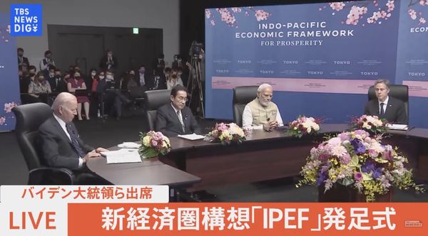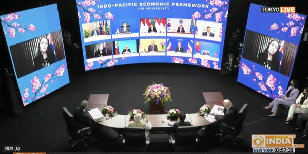 5月23日下午,美国总统拜登、日本首相岸田文雄和印度总理莫迪在东京都六本木的泉花园画廊举行“印太繁荣经济框架”(简称“印太经济框架”、IPEF)启动仪式,其他初始成员国领导人或部长级官员通过视频方式远程参会。IPEF是拜登亚洲之行的核心议程。