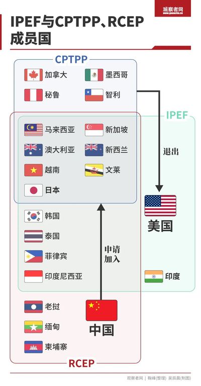 观察者网统计,RCEP(区域全面经济伙伴关系协定)15个成员中的11个、以及CPTPP(全面与进步跨太平洋伙伴关系协定)11个成员中的7个此次签约加入IPEF。有7个国家(马来西亚、新加坡、澳大利亚、新西兰、越南、文莱、日本)同时是RCEP、CPTPP、IPEF三个框架下的成员。