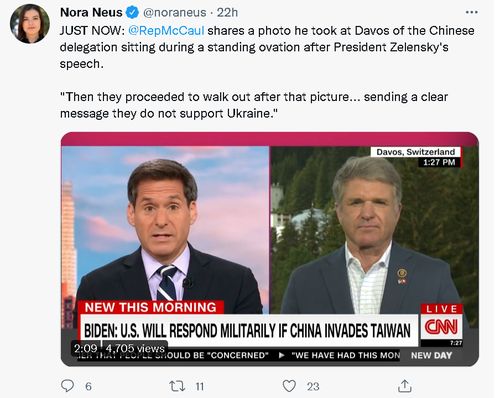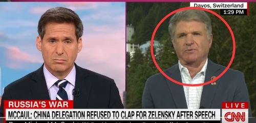 这场演讲结束后,一个当时在现场参会的美国政客,突然找到了美国CNN的新闻主播约翰·伯曼(John Berman),称他拍到了一张“中国代表团”在泽连斯基讲话结束后拒绝鼓掌,还迅速离席的照片。这个名叫迈克尓·麦考尔(Michael McCaul)的美国政客还指控说,“中国代表团”的做法说明他们“不支持乌克兰”,甚至称中国代表团的手上“沾满了乌克兰人的鲜血”。