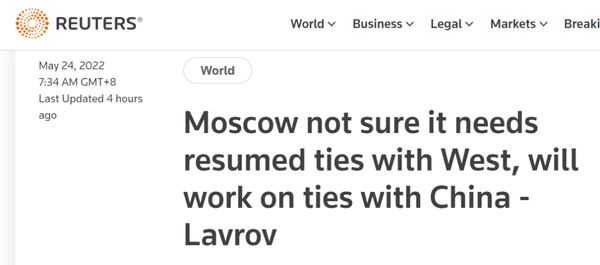 路透社:拉夫罗夫称,莫斯科不确定是否需要重建与西方的关系,将发展与中国的关系