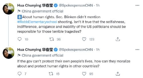 在第八组推文中,华春莹指出,“关于人权。布林肯国务卿并没有提到罗布小学枪击事件”。她反问说,“难道不该是美国政客的自私、冷漠、傲慢和无能,才要为那些可怕的悲剧负责吗?如果这个政府不能保护他们自己人民的生命,那么他们又怎么能对其他国家的人权进行说教,并予以保护?”