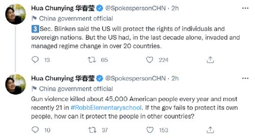 “布林肯国务卿表示,美国将保护个人和主权国家的权利。但仅在过去十年,美国就入侵并操纵了超过20个国家的政权更迭。枪支暴力每年造成大约4.5万美国人死亡,最近在罗布小学有21人丧生。”华春莹在第三组推文中质问美方,“如果这个政府不能保护自己的人民,那么它又如何保护其他国家的人民?”