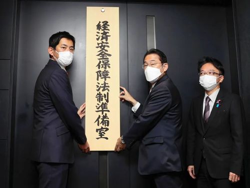 岸田文雄2021年11月为“经济安全保障法制准备室”挂牌,图自共同社