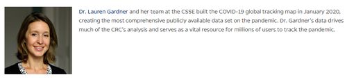 约翰·霍普金斯大学新冠资源中心重点介绍了6位专家,其中第六位正是劳伦·加德纳。网站上写道:劳伦·加德纳博士和她的团队于2020年1月创建了新冠疫情全球跟踪地图,创建了关于大流行的最全面的公开可用数据。加德纳博士的数据推动了约翰·霍普金斯大学新冠资源中心的大部分分析,并成为数百万用户追踪大流行的关键资源。