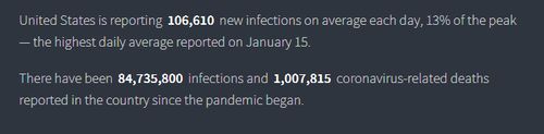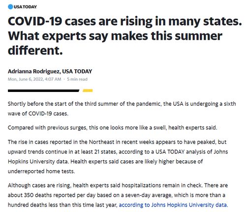 6月6日,《今日美国报》刊发报道称,在大流行的第三个夏天开始前不久,美国正在经历第六波疫情。尽管病例在上升,但健康专家表示,住院人数仍在控制之中。根据7 天的平均值,目前美国大约每天报告死亡350 人,比去年同期减少了 100 多人。这一数据正是援引自约翰·霍普金斯大学。