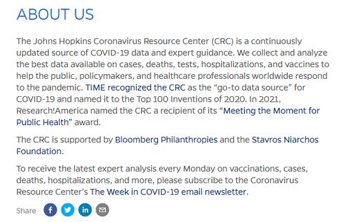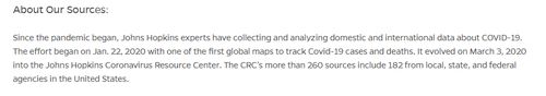 网站上还有这么一段介绍:自大流行开始以来,约翰·霍普金斯大学的专家一直在收集和分析有关疫情的国内和国际数据。这项工作于2020 年1 月22日开始,是首批追踪新冠病例和死亡人数的全球地图之一。它于2020年3月3日演变为约翰·霍普金斯新冠资源中心(CRC)。CRC的260 多个来源中,182个来自美国地方、州和联邦机构。