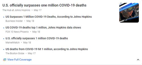 从谷歌新闻上搜索,并没有找到这样的消息,倒是在5月17日和18日,包括《商业内幕》《波士顿环球报》在内的多家美国媒体报道了美国疫情死亡人数突破100万的消息,而消息源引用的正是约翰·霍普金斯大学的统计数据。