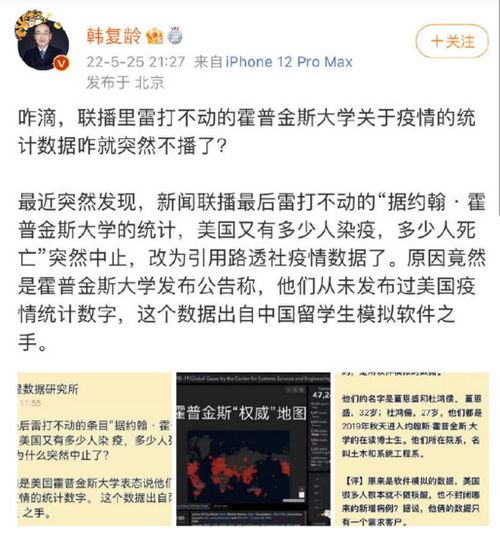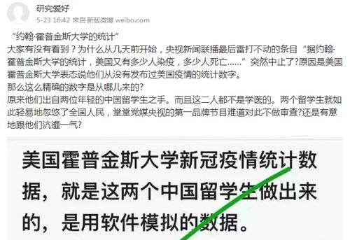 5月23日,微博上就有人发帖声称,央视《新闻联播》“突然中止”引用约翰·霍普金斯大学的统计,“原因是美国霍普金斯大学表态说他们从没有发布过美国疫情的统计数字。那么这么精确的数字是从哪儿来的?原来他们出自两位年轻的中国留学生之手。而且这二人都不是学医的……”