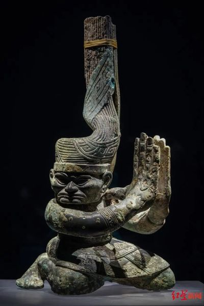 这类形象在三星堆遗址、成都方池街遗址曾有过发现,却不见于中国其他地区,应该是古蜀王国特有的一种艺术造像。