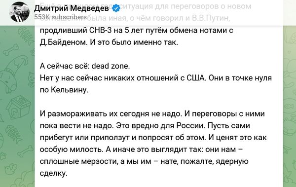 据俄媒俄新社当地时间20日报道,谈及对俄美之间关于削减核武器谈判的看法,俄罗斯联邦安全会议副主席德米特里·梅德韦杰夫当天直言不讳道,目前与美国进行任何削减核武器的谈判都没有意义,莫斯科方面应等待美国前来恳求谈判的时刻,“让他们(美国)自己跑过来或者爬过来求我们谈判吧。”这一回应,他还发布在个人telegram上。