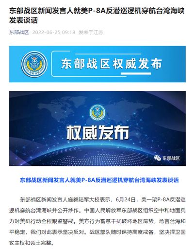 东部战区新闻发言人就美P-8A反潜巡逻机穿航台湾海峡发表谈话