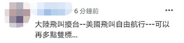 对于台媒炒作美军机P-8A飞越台海,“展现对自由开放印太承诺”,有岛内网友讽刺,“大陆飞叫扰台,美国飞叫自由航行,可以再多点双标。”
